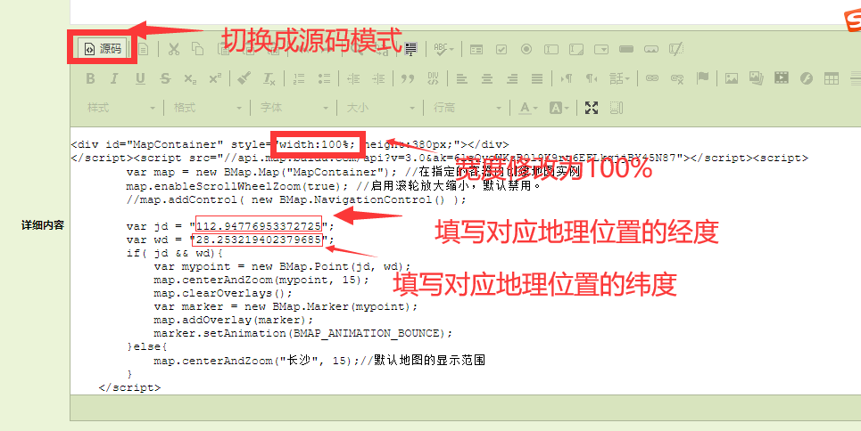 示例源码如下 黄色部分为自己修改部分,经度和纬度获取方式可以百度地图里面查找获得