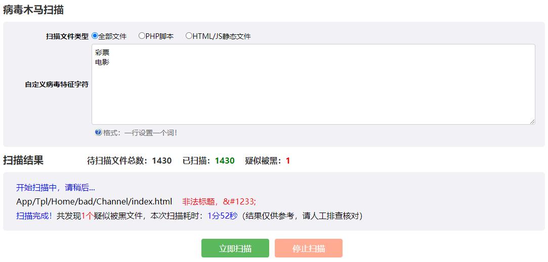 插件根据云端病毒特征码+自定义病毒特征(选填)来检测网站是否包含病毒木马文件!