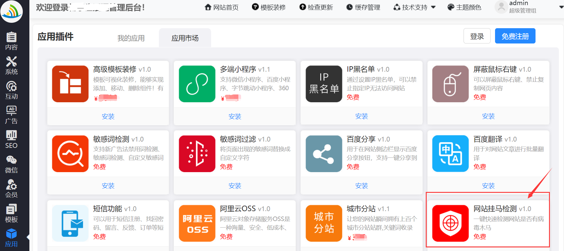 网站后台——》应用——》我的应用——》找到“挂码检测插件”——》点击安装