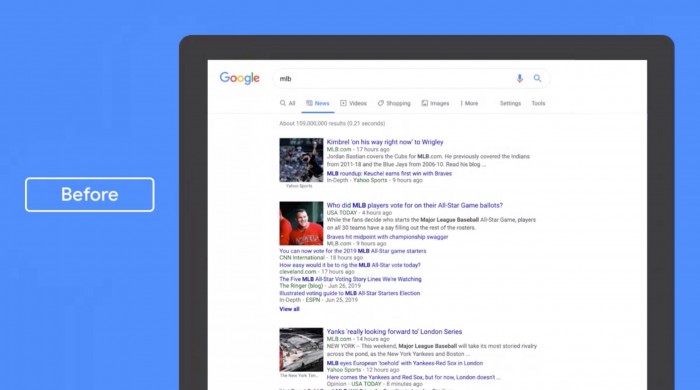 在主搜索视图中,每张卡片都提供了封面图片、标题和时间。读者可以浏览并点按右上角的箭头以查看更多内容,这风格和Google News热门头条相似。而且每张卡片之间的间距大幅增加,不会紧紧的叠加在一起。下方的新闻链接以浅灰色卡片形式出现,右侧会包含该链接的图片,包含整个标题和简短的摘要。